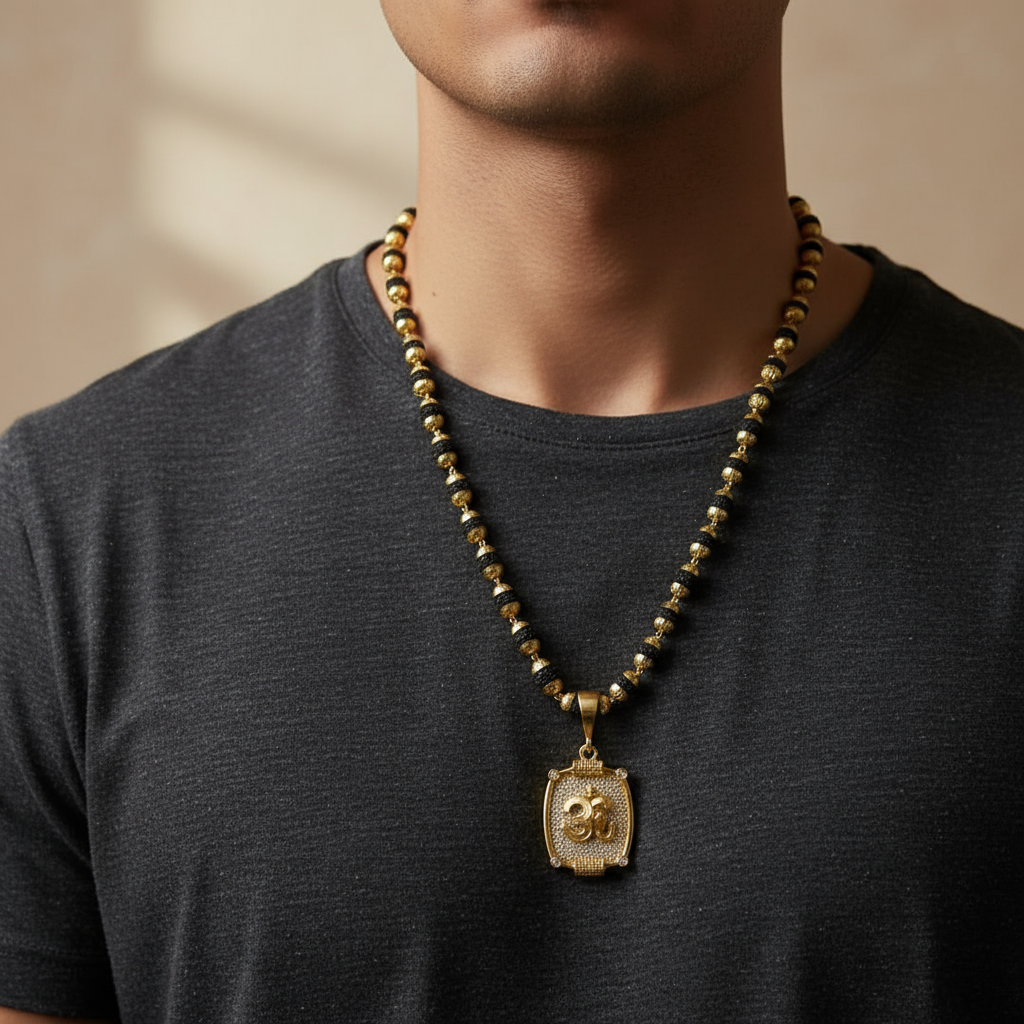 Elevate your style and spirituality with Omkara's exquisite Premium Gold Plated Pendant paired with a Rudraksha Mala, seamlessly blending the divine with the fashionable. This stunning pendant not only adds a touch of luxury with its gold plating but also carries deep spiritual significance, making it the perfect accessory for enhancing your inner peace and outer beauty on any occasion.